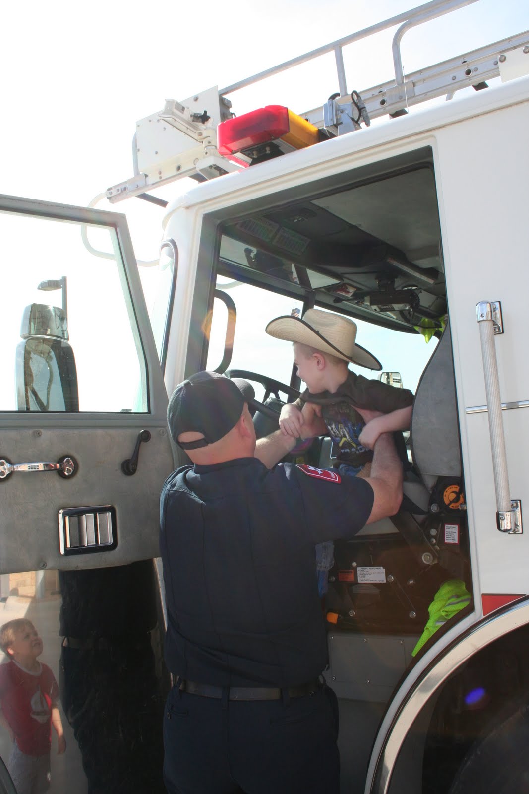 Afterwards everyone got a fire hat. The kids loved them! Hunt immediately wanted to take off his cowboy hat and put on the plastic fire fighter one.